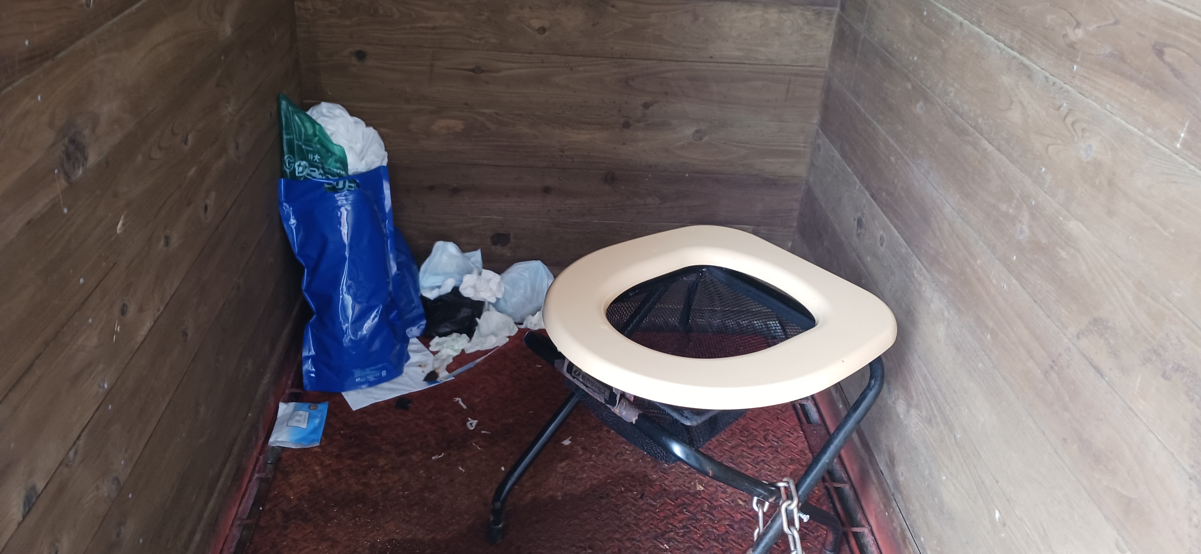 携帯トイレブースの1基の便座のネットの中に、汚れた紙が放置されていた。もう1基は、取っ手がなく、開けることができなかった。
